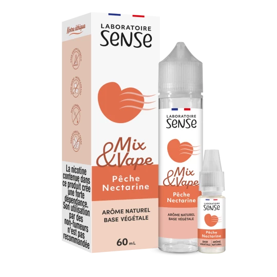 Le Laboratoire Sense sort une version Mix & Vape 60 ml de ses e-liquides vedettes. Le e-liquide Pèche nectarine Mix & Vape en 60 ml est disponible en deux taux de nicotine. Selon le taux choisi, le pack Mix & Vape contient :